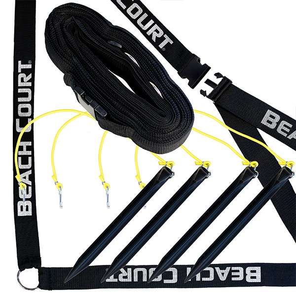 This Beach Court 2 inch black volleyball boundary is perfect for sand or grass play and is the FIVB and AVP regulation size of 8x16 meters. It includes four 10" ABS corner stakes with bungee cord attachments, and durable plastic buckles that is easy to use and designed for long-lasting use. And to stand out from the rest, it is printed with BOLD Beach Court print.