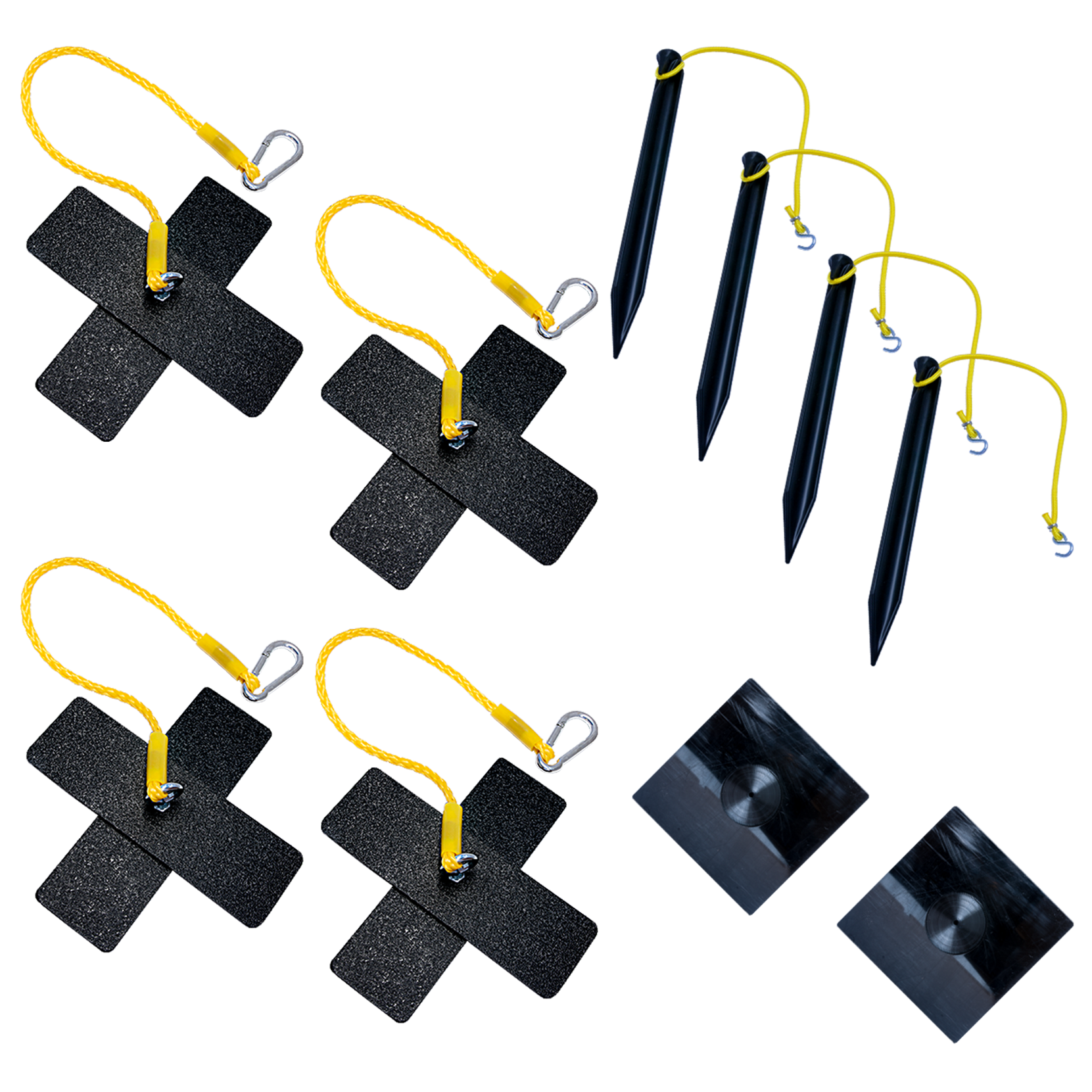 | Four guyline attachments with carabineerss Two butterfly poles plates Four sand boundary anchoring kits |