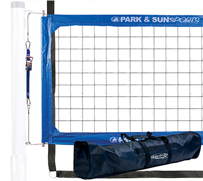Equipped with a professional-grade volleyball net—Regulation size volleyball net features highly visible 4’’ binding made from 13 oz. heavy-duty vinyl and a coated-steel cable throughout the top and bottom. Wooden dowels are built in for effortless attachment to a fixed pole system for immediate use
