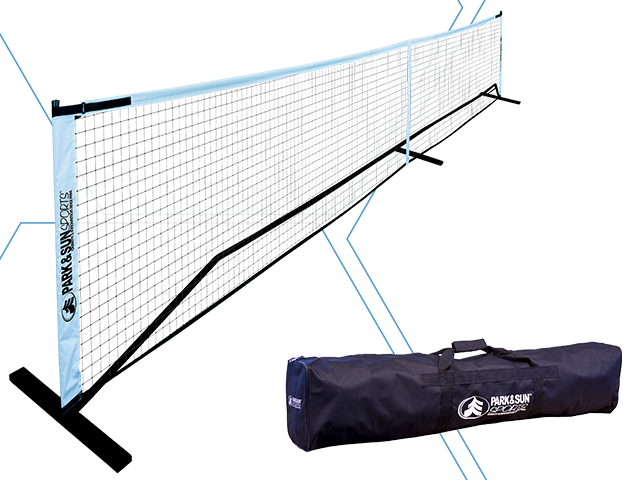 This quick and easy, super-portable pickleball tennis net. Adjustable, between 15’-18’, 21’. Set up a pickeleball match in the driveway, the park - or anywhere with a flat surface.