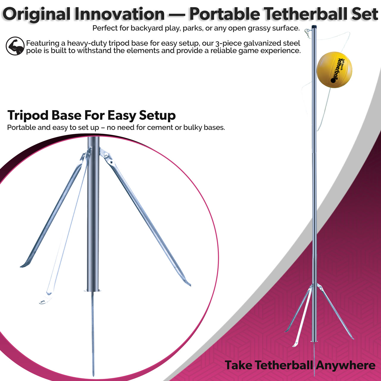 3-piece 1-5/8 inch galvanized steel poles are highly durable and rust-resistant. Includes a Soft-Touch tetherball with cord, ball pump and carabiner clip for secure tether attachment.